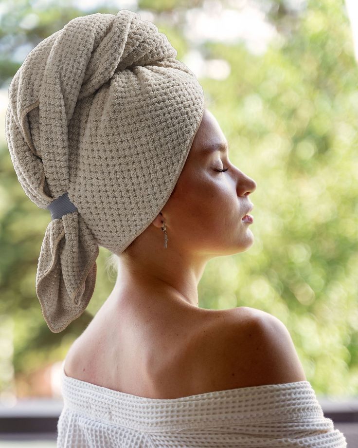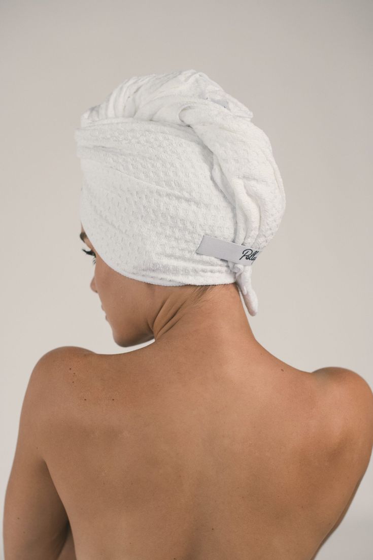 Skonsam mikrofiber som tar hand om håret medan det torkar.